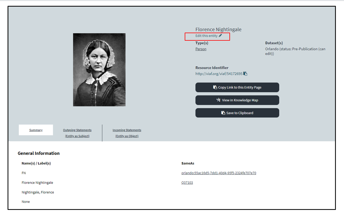 - Find the entity in ResearchSpace that you want to connect a new entity to. Click Edit this entity on the entity summary page (or the Edit icon on the entity card). This opens an entity editing form as described under Edit an Entity.
