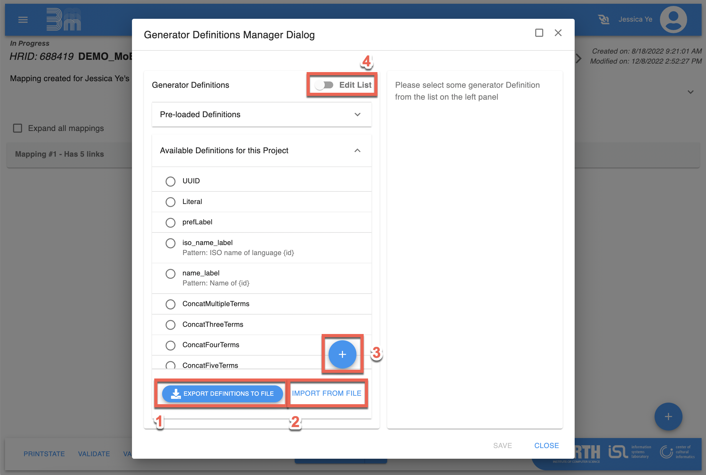The Generator Definitions Manager Dialog window lets you specify how you want to create entity labels and identifiers.